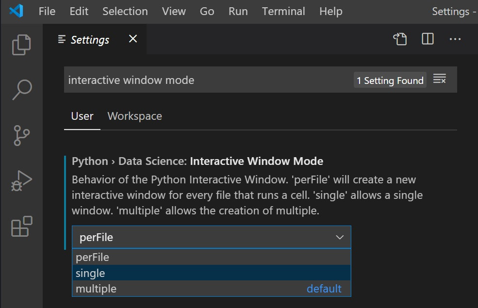 如果希望保留单个交互式窗口行为,则可以将交互式窗口模式的值设置为 “single”。