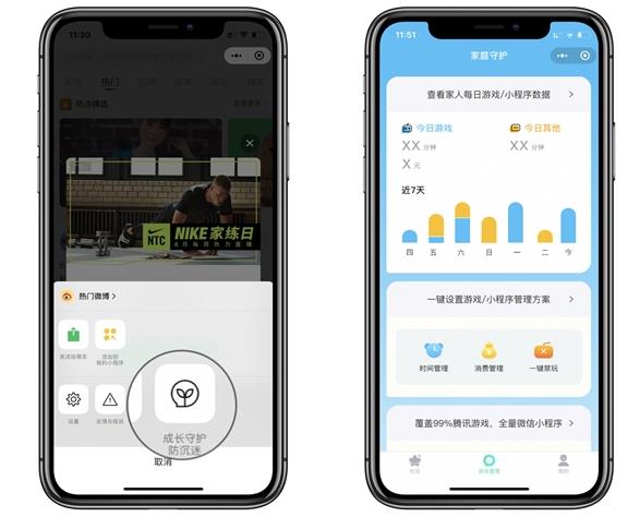 5、小程序新增防沉迷按钮和开发团队信息。点击“成长守护防沉迷”将跳转到“腾讯家庭守护”界面,可以在里面查看今天和近七天的游戏情况,包括游戏时长、游戏花费、登录日志等。