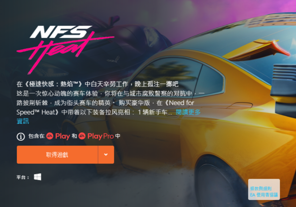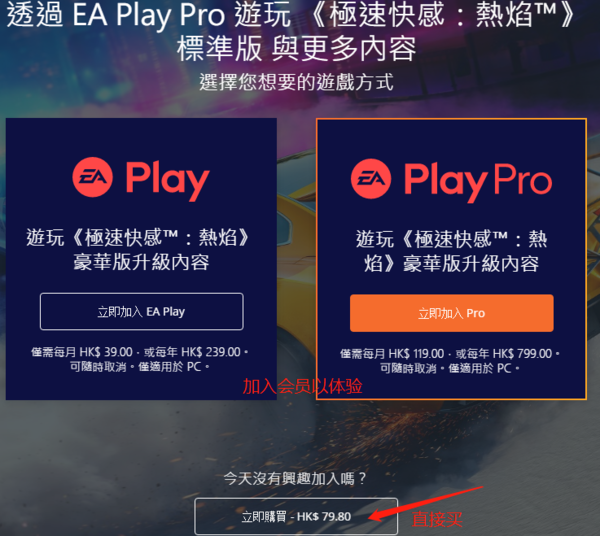 当我们在购买界面中,可以看到3个按钮,其中第有两个是EA?play相关的,这两个入口告诉我们,只要购买EA?play或者EA?play?pro就可以免费体验游戏以及更多该平台相关的内容。如果有相关需求的玩家,可以考虑直接入手EA?play或者pro。而对于另一些玩家,只想玩这款游戏,比如小编,只想买极品飞车:热度,那么就点击下方的“立即购买”即可购买该游戏。