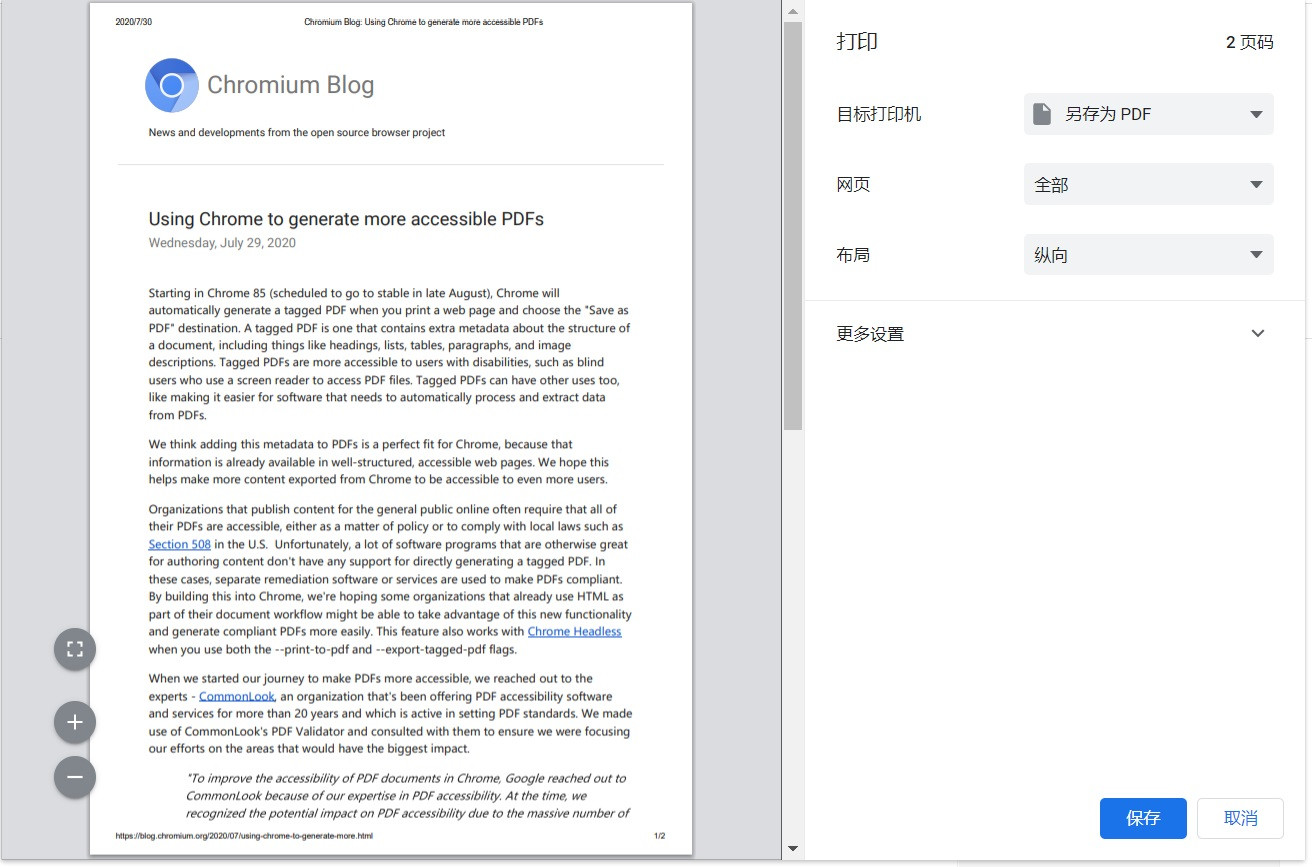 Chrome 无障碍访问技术负责人 Dominic Mazzoni 今日发文宣布,从 Chrome 85 开始,当用户选择打印网页并另存为 PDF 时,Chrome 将自动生成带标签的 PDF。