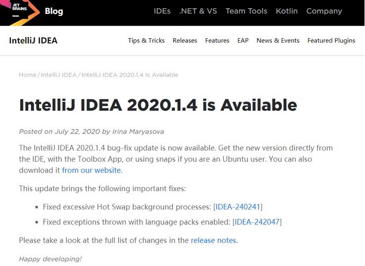 IntelliJ IDEA 2020.1.4 主要修复了过多的热插拔后台进程,以及启用语言包时引发的异常。