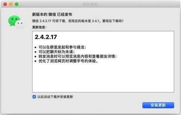 腾讯 macOS 版微信迎来了 2.4.2.17 版本更新,可以把聊天标为未读;转发消息时可以预览消息内容和查看朋友详情;优化了浏览网页时调整字号的体验。