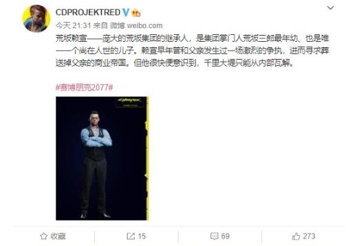 本周一晚间,《赛博朋克 2077》发行商 CDPR 通过官方微博公布了游戏人物 “荒坂赖宣”简介,称其为庞大的荒坂集团的继承人。