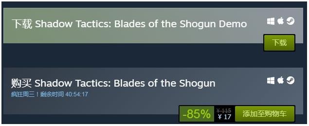 游戏《影子战术:将军之刃》目前已在 Steam 平台开启特惠,史低促销仅售 17 元(原价 115 元),活动时间还剩约 40 个小时。这款游戏在 Steam 平台获得 “好评如潮”评价,感兴趣的玩家可以了解一下。