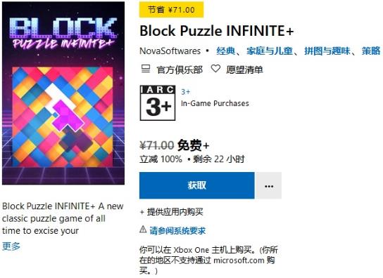 微软商店现已开启对解谜游戏《Block Puzzle INFINITE+》的免费领取活动,距离活动结束仅剩约 20 小时。据悉,该游戏的原价为 71 元,活动时间内可免费领取。