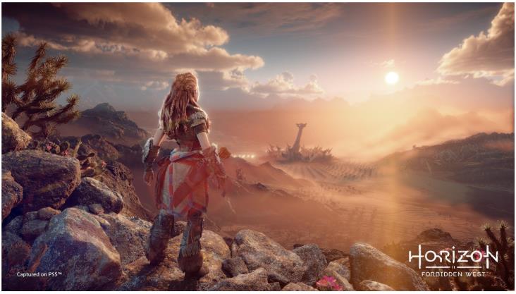 官方称,新截图截取自PS5版。第一张截图展示坠毁的客机,以及翱翔的翼龙状机械生物“太阳之翼”。第二张截图则展示了阿洛伊(Aloy)站在岩石上眺望远处的场景。