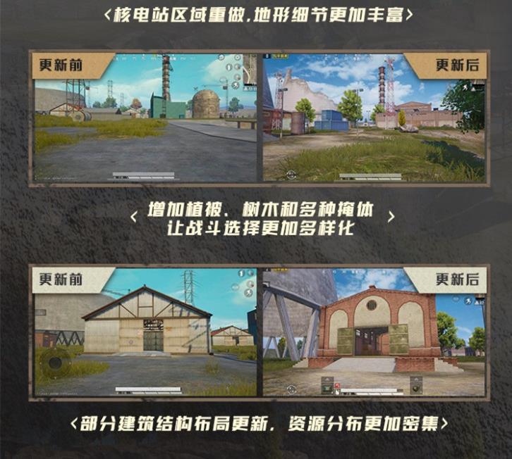 核电站区域重做,建筑结构布局更新;优化矿场地形结构,调整建筑布局,新增 7 个大型仓库;监狱区域地形结构调整,周围新增更多围墙,部分建筑布局调整;增加若干野外资源点。