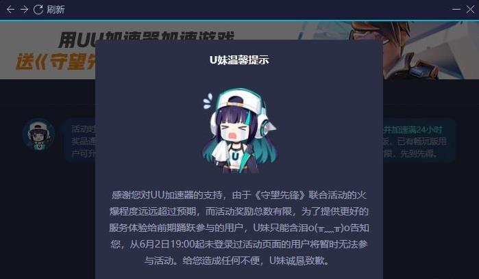 网易 UU 加速器公告称由于《守望先锋》联合活动的火爆程度远远超过预期,为了提供更好的服务体验给前期踊跃参与的用户,从 6 月 2 日 19:00 起未登录过活动页面的用户将暂时无法参与活动。