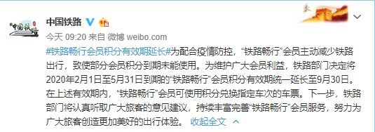 了解到,此次延长措施主要面向2020年2月1日至5月31日到期的“铁路畅行”会员,其积分有效期将被统一延长至9月30日。