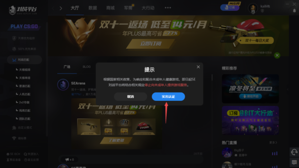 2.接着如果你的账号没有进行实名认证的话,软件就会提示进行认证,点击【实名认证】按钮。