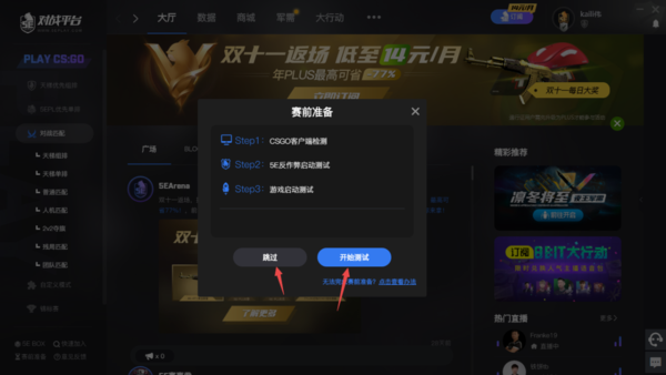 4.接着再次点击【对战匹配】模式下的【天梯组排】,然后软件会弹出赛前准备的窗口,我们可以点击【开始测试】按钮,也可以点击【跳过】按钮,这里点击【跳过】按钮。最后我们就可以开始在5E对战平台上玩csgo游戏了。