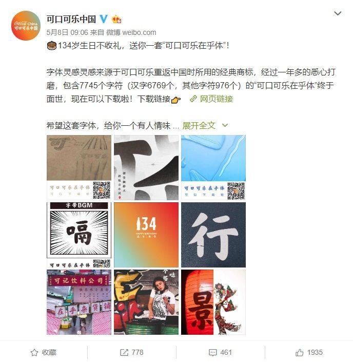 根据可口可乐中国的消息,可口可乐推出了中文品牌字体“在乎体”,包含7745个字符(汉字6769个,其他字符976个),个人非商业使用和公益使用,都能获得免费授权。