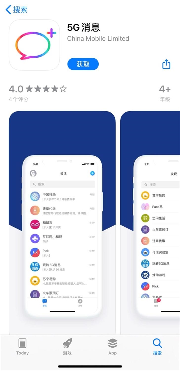 经查,由中国移动推出、名为5G消息的APP已在苹果App Store及部分Android应用商店上架,版本1.0.0。