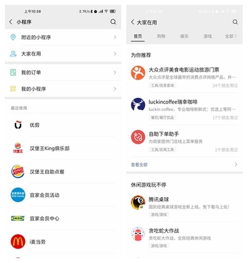 小程序页面这一次也进行了不小的改动,增加了“建议使用”、“常用服务”、“动态”几个新的标签以及一个“大家在用”,会展示你的好友正在使用的小程序并且以类别进行分类,便于查询。