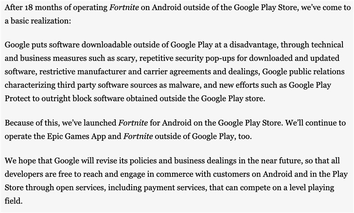 Epic表示,他们之所以这样做,是因为谷歌通过警告用户可能不存在的潜在安全问题,并将任何未通过Play Store发布的软件定性为恶意软件,使第三方软件处于不利地位。