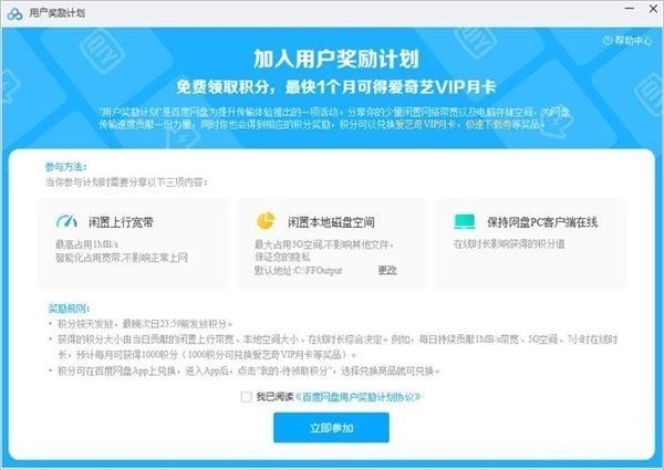 据网友反馈,今天登录百度网盘后,发现百度网盘推出了一个用户奖励计划,“用户奖励计划”是百度网盘为提升传输体验推出的一项活动。分享你的少量闲置网络带宽以及电脑存储空间,为网盘传输速度贡献一份力量,同时你也会得到相应的积分奖励,积分可以兑换爱艺奇VIP月卡,极速下载券等奖品。