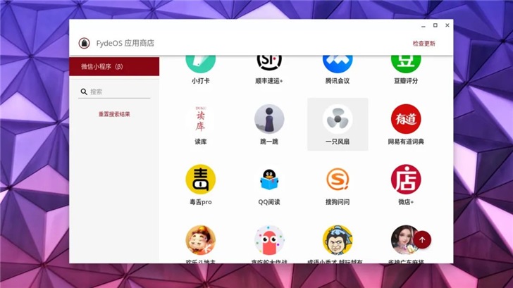 从此次更新开始 FydeOS 加入了微信小程序硬件框架的支持。你可以在「应用商店」的菜单里找到「微信小程序 (β)」,在此甄选了一小部分热门的微信小程序和小游戏,你只需要点击图标即可实现「打开即用,用完即走」。