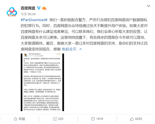今日凌晨,百度网盘官方微博针对上述事件做出回应,表示我们一直积极配合警方严厉打击侵犯百度网盘用户数据隐私的犯罪行为。同时百度网盘也会持续通过技术不断提升用户体验。如果大家对百度网盘有什么建议或者意见,可以联系我们,我们会悉心听取大家的反馈,让百度网盘未来可以更棒。这里悄悄透露下,有些具体的措施在今年就可以落地,大家敬请期待。