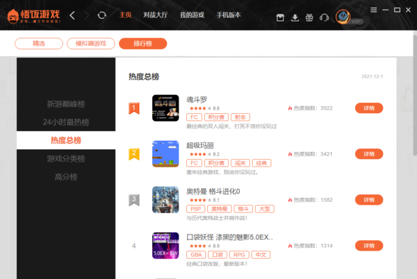 在电脑上安装好悟饭游戏厅,并注册登录自己的账号之后,在悟饭游戏厅首页,玩家就能根据游戏类型,查找自己感兴趣的游戏。当然了,也可以在排行榜中,查看最近热门的游戏或者高评分的游戏。如果知道游戏的名字,也可以直接在搜索框中,输入名字进行下载。