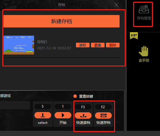 同样是在超级玛丽游戏界面,点击页面下方的“快速存档”键,就能保存当前的游戏进度;点击“快速读档”键,就能跳转到之前保存的游戏进度中。当然了,在窗口右侧的“存档管理”中,也能进行存档和读档,如果保存有多个游戏进度,还能自由选择存档进度体验游戏。