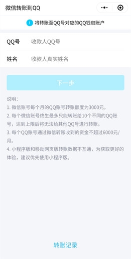 另外,微信转账到QQ小程序版和移动网页版转账数据不互通,为获取更好的体验,官方建议优先使用小程序版。