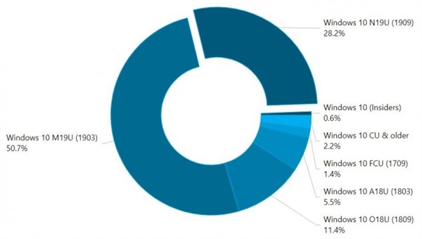 调研机构AdDuplex给出的统计数据显示,1903版的使用率从52.6%下降到50.7%,1809版的使用率从16.4%下降到11.4%。有趣的是,1803版本从4.9%增加到5.5%,1709版本从1.2%增加到1.4%,而更旧版本从1.7%增加到2.2%。 AdDuplex推测这可能是由于越来越多的人在家中,并启动了较旧的PC,此外内测人员的数量保持稳定。