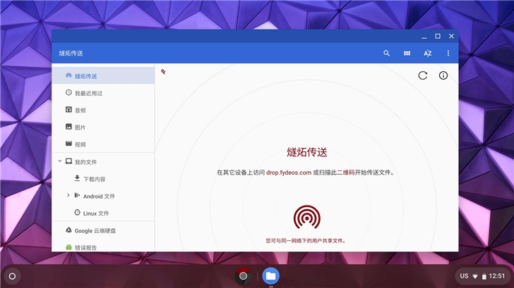 在「文件」app 中内嵌了对「燧炻传送」的支持,让你更方便地与其它设备在局域网内传送文件。只需要在同一内网下的其它设备上访问drop.fydeos.com即可自动建立连接。