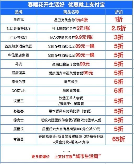 第二。西贝、小龙坎、奈雪的茶、金逸影城、爱康国宾等全国上万商家,联合支付宝启动“城市生活周”。在20天里,商家们将发放超千万张优惠券,最低至1折,快乐都会回来的。