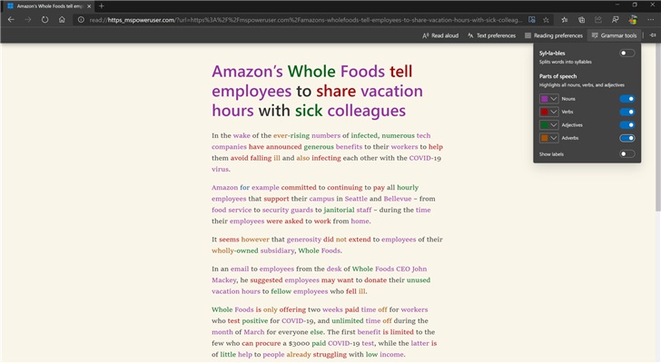当前,Edge Canary浏览器支持名词、动词、形容词和副词。启用“沉浸”模式时,用户将能够从Grammer语法工具访问该功能。