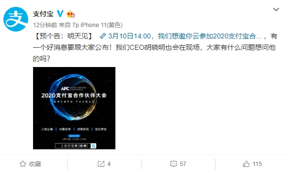 新版首页刚曝光,支付宝官方就宣布,将于3月10日(明天)举办2020支付宝合作伙伴大会。据悉,届时会有一个好消息跟大家公布,蚂蚁金服CEO胡晓明也会在现场。