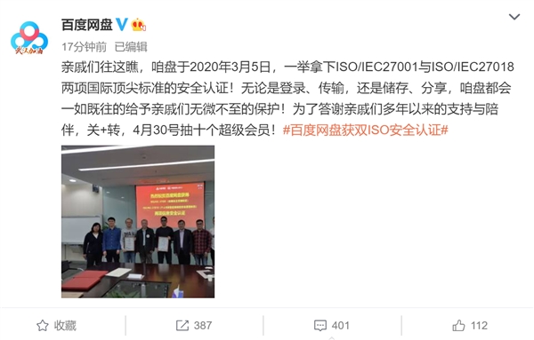 百度网盘今日(3月6日)宣布,一举拿下ISO/IEC27001与ISO/IEC27018两项国际顶尖标准的安全认证!