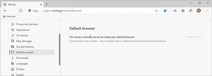 在“设置”页面上,微软指出“无法将Canary频道设置为默认浏览器。Canary的版本可能不稳定-因为是每天发布,以验证错误修复和测试全新功能。”