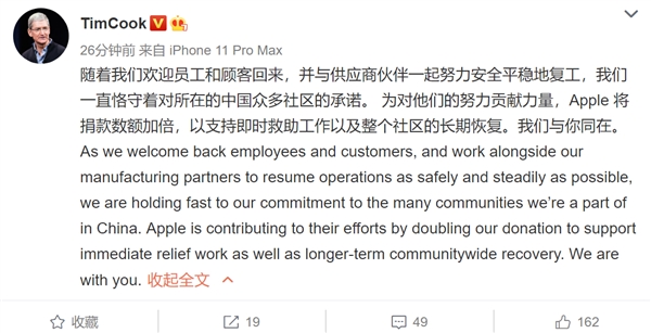 似乎是感到必须做出回应,苹果CEO库克今晨在微博发文,他指出“随着我们欢迎员工和顾客回来,并与供应商伙伴一起努力安全平稳地复工,我们一直恪守着对所在的中国众多社区的承诺。”