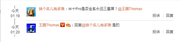 2月14日消息,有网友在小米公司产品总监王腾微博下留言:小米10 Pro是否永远全系三星屏?