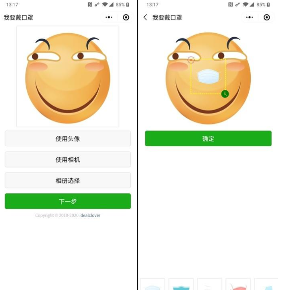 这个小程序支持选择多种口罩,例如普通的医用口罩,或者更高级的N95口罩,乃至类似防毒面具的口罩,都能添加到头像中。
