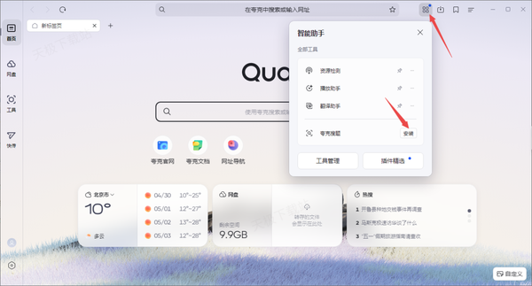 1、启动电脑端的浏览器,点击顶部右上角的【四个小方块】图标,然后找到【夸克搜题】工具,点击其右侧的【安装】按钮。