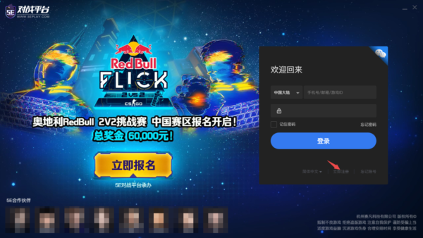 1、启动电脑上的5E对战平台,然后在软件的主界面当中,点击右侧登录栏下方的【立即注册】选项。