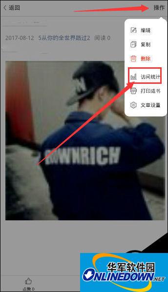 2、进入文章之后选择右上角的【操作】-【访问统计】;