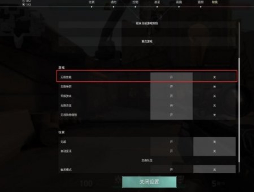 3、进入游戏对局后,按下Esc键打开设置菜单,在设置界面的顶部最右侧,找到并点击“秘技”选项。下拉找到“无限技能”选项,并将其设置为开启状态。然后你可以在游戏中享受无限技能带来的独特体验了。