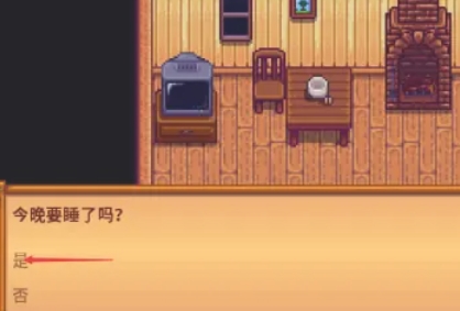 进入房子后,找到床的位置。靠近床时,游戏会弹出一个提示框,询问“今晚要睡觉了吗?”。