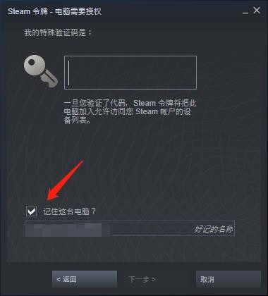 1、在需要共享的电脑上登陆steam游戏账号。完成登陆输入验证码时,点击位于下方框中的“记住这台电脑”。