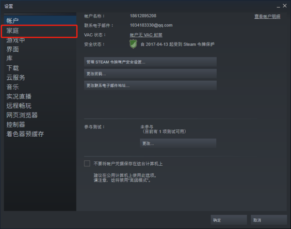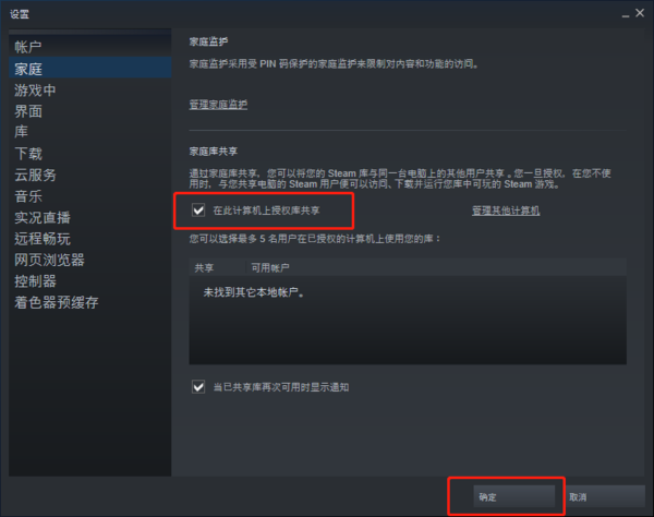 4、在家庭页面中,勾选位于中央的“在此计算机上授权库共享”后,点击确定,即可完成游戏库共享。