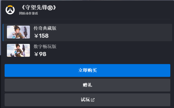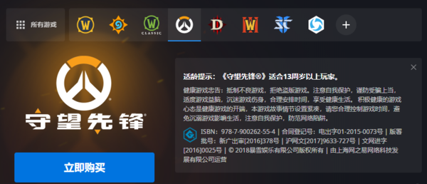 打开到暴雪战网客户端主页面后,选择一款想要玩的游戏,比如说《守望先锋》。点击对应的游戏图标,在打开页面中,选择“立即购买”。