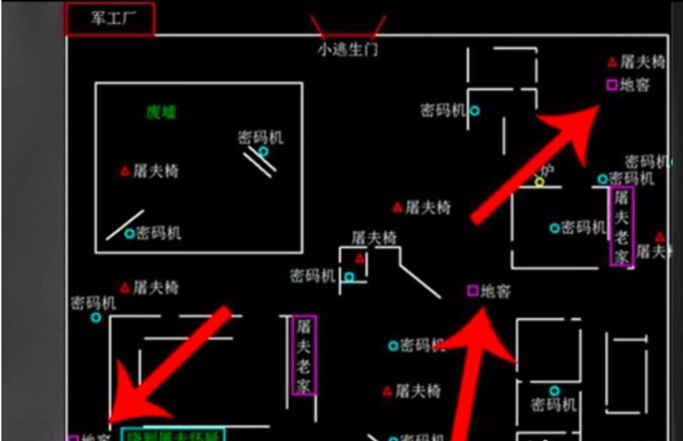 1,以军工厂为例,这个地图有三个地窖:一个在无敌房外围,一个在小木屋前的两个围墙之间,一个在中场四合院附件。