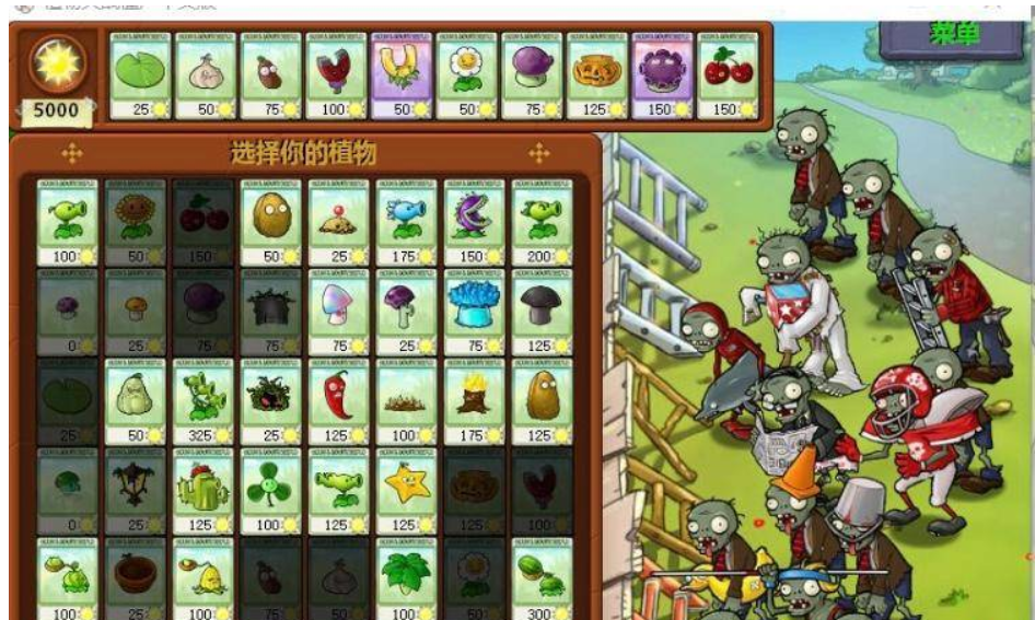 1.为了更快赚到金币,选择《谁笑到最后》这个模式,该模式的设定为:开局拥有5000阳光,且每过一波后获得250阳光、可以提前摆阵,植物无冷却,这样可以使阵容快速成型了,但不能选择向日葵、阳光蘑菇和免费的2种蘑菇。僵尸防御高的有铁桶、橄榄、铁珊门。特别要注意小丑僵尸,被炸掉一个植物就损失惨重了,所以要将其快速解决掉。如下图为选择的植物,为了赚金币,缺一不可。