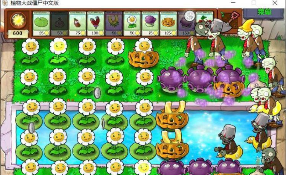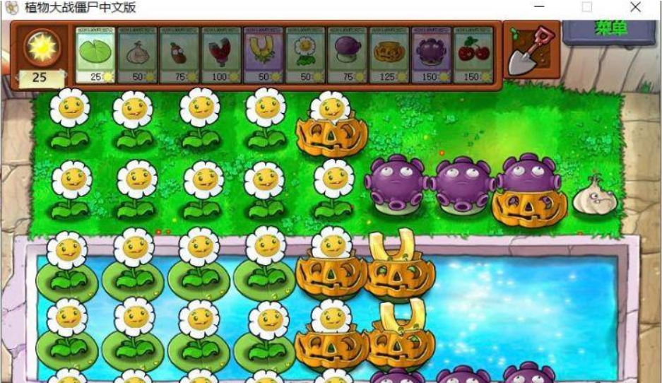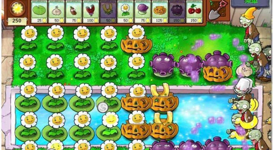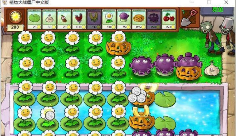 2.开局阵容,如下图。留两百个阳光,以免蒜头或者南瓜头被吃掉。