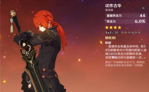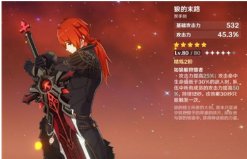 497面板(四星武器中的天花板,廉价的获取让其他四星登不了台),,22.7%攻击加成,15s一次的240%额外伤害加成。