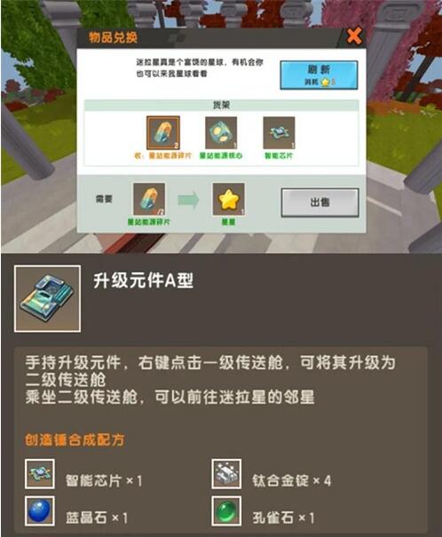当然了,冒险家们也可以跟空岛神殿的NPC进行交流,在空岛NPC的对话货架上也有星站能源核心和智能芯片。拿出钛合金工匠锤在创造台上材料成功合成了升级元件A型,星球旅行即将开启!
