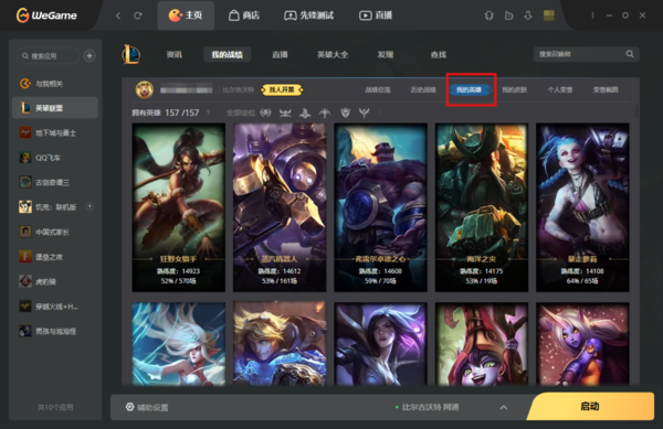 如果想看某个英雄的胜率,可以在wegame英雄联盟界面上方的“我的英雄”中查看。