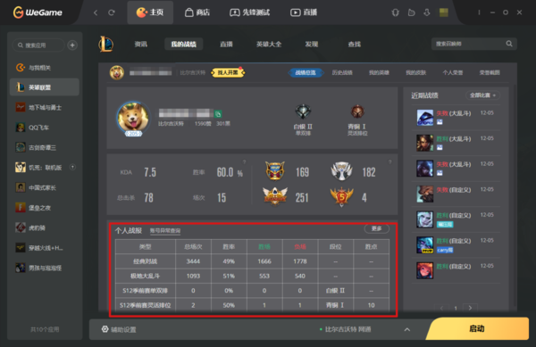 我们在使用wegame查英雄联盟游戏胜场时,从wegame客户端进入“我的战绩”界面,在下方可以看到“个人战绩”,底下的表格中,我们可以看到自己在各种模式下的总场次、胜率、胜场、负场、各赛季的段位以及胜点情况。这些数据都是以第一场对局到最近一局比赛的胜负为依据计算出的数值。
